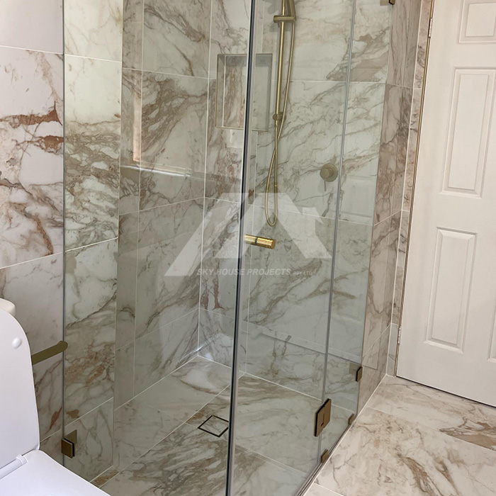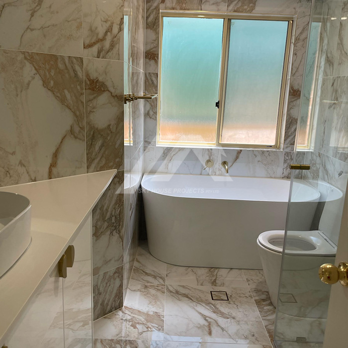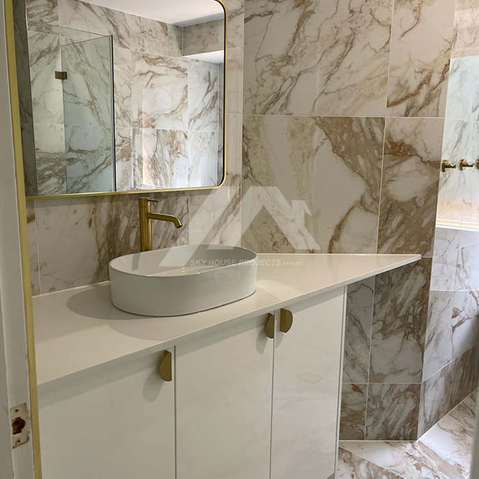 Materials used: stone bench top, frameless shower screen, polyurethane cabinets and brushed gold accessories.